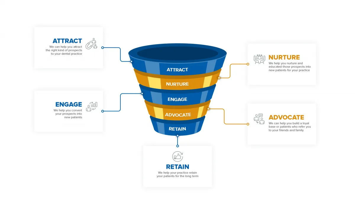 Using a proven system, the team at Bullseye Dental Marketing will attract, convert, engage, sell, and connect leads for your practice. These steps are guaranteed to boost your online presence and increase business.